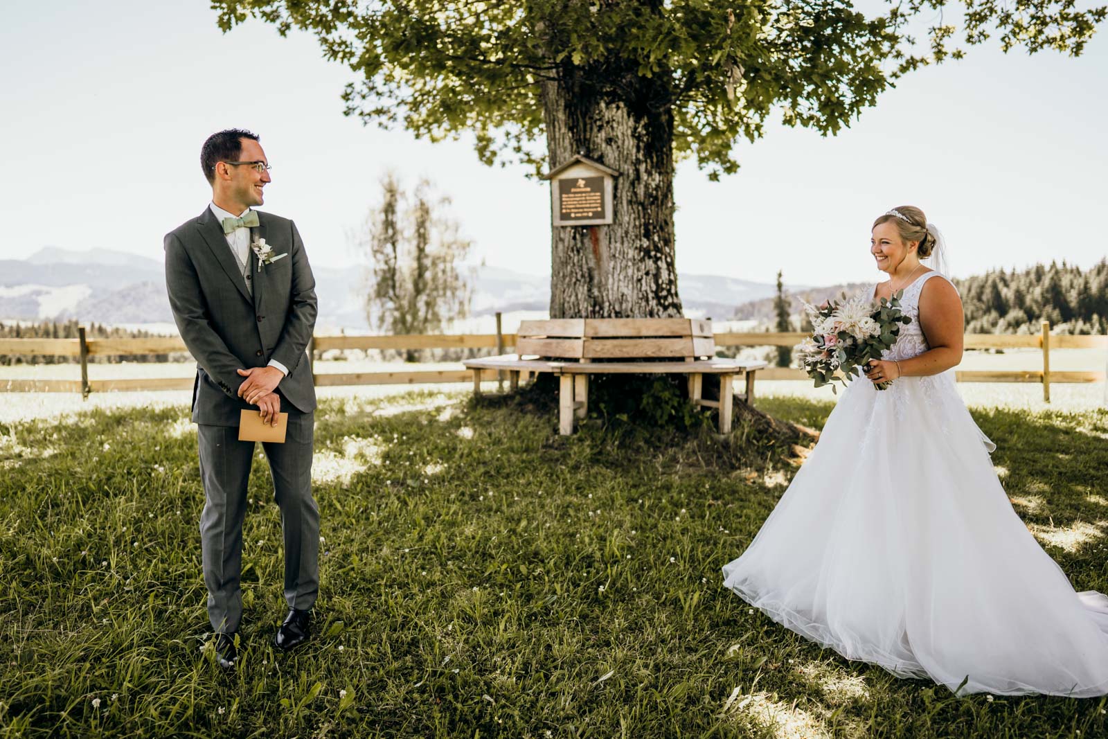 Nach dem Getting Ready folgte einer der emotionalsten Momente des Tages: der First Look an einer bezaubernden kleinen Kapelle, die einsam auf einem Berghügel thronte. Fernab vom Trubel, nur umgeben von der atemberaubenden Allgäuer Berglandschaft.