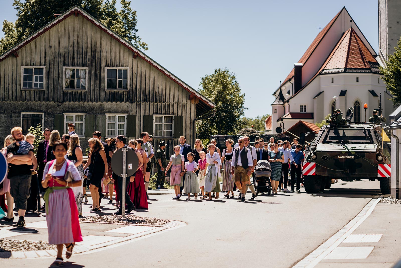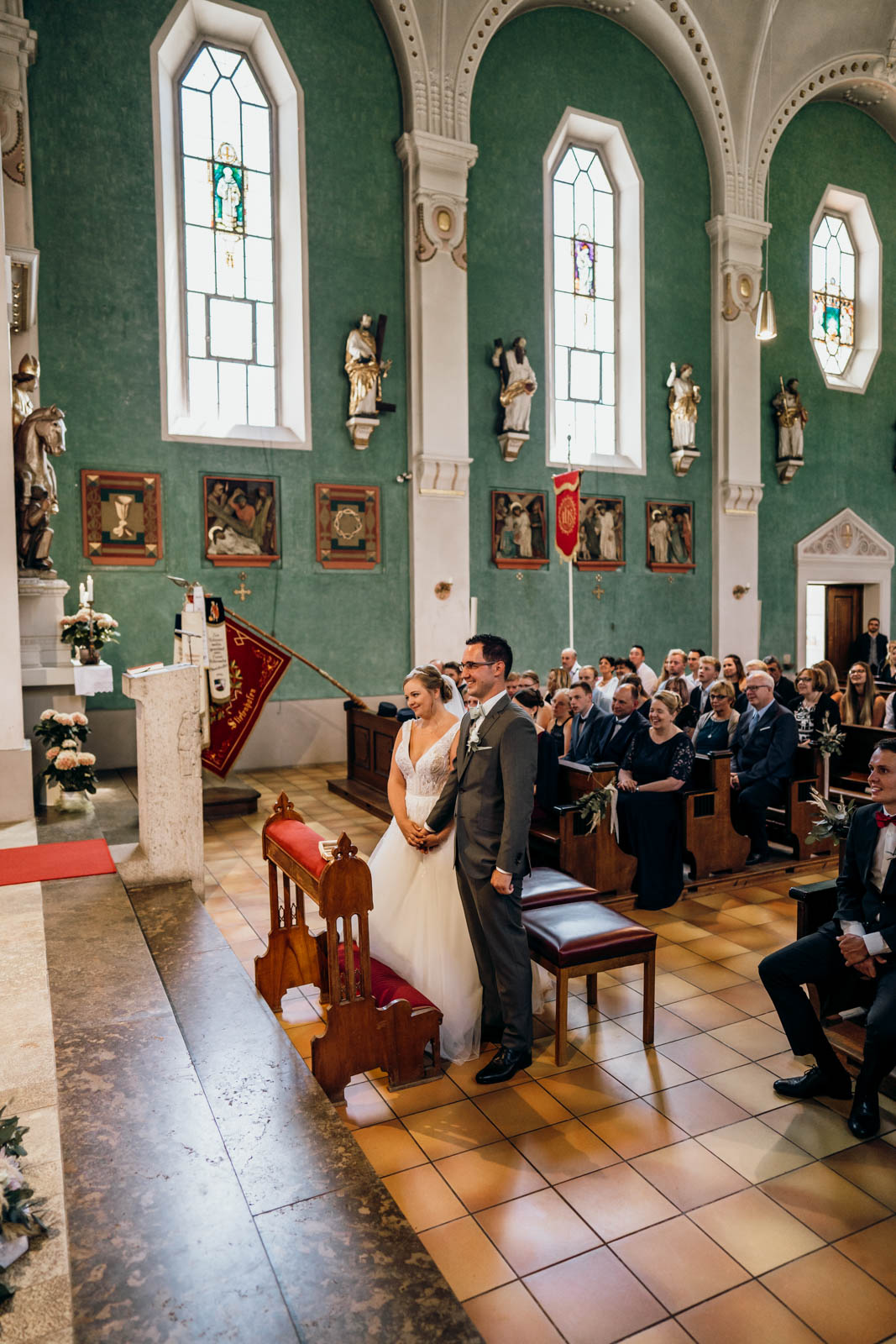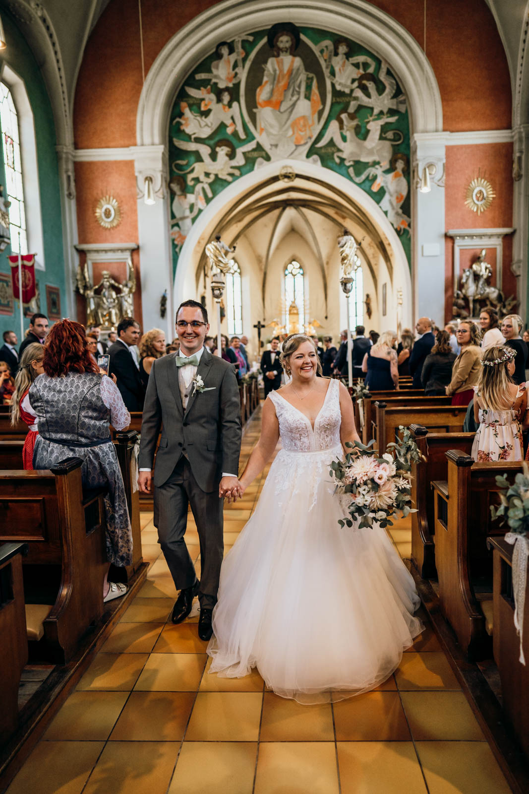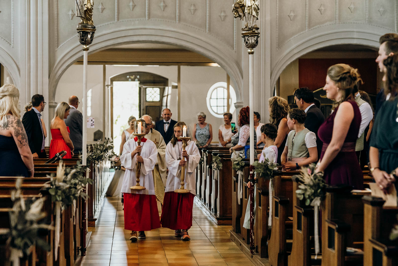 Der Weg von der intimen Kapelle zur Kirche war bereits ein kleines Highlight. In der Kirche warteten schon alle 150 Gäste gespannt auf das Brautpaar. Die Atmosphäre war elektrisierend – diese Mischung aus Vorfreude, Rührung und Feierlaune, die nur Hochzeiten haben.