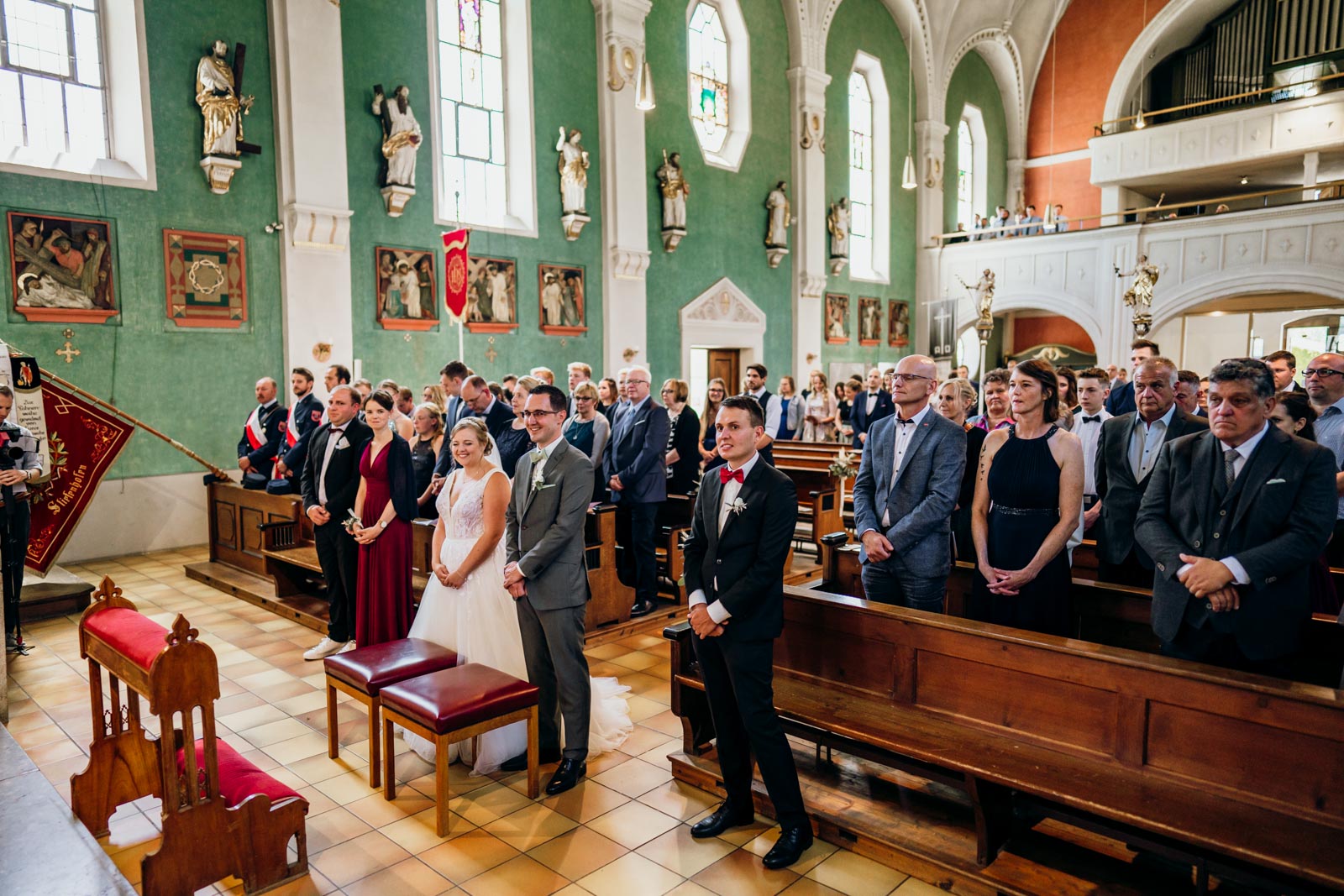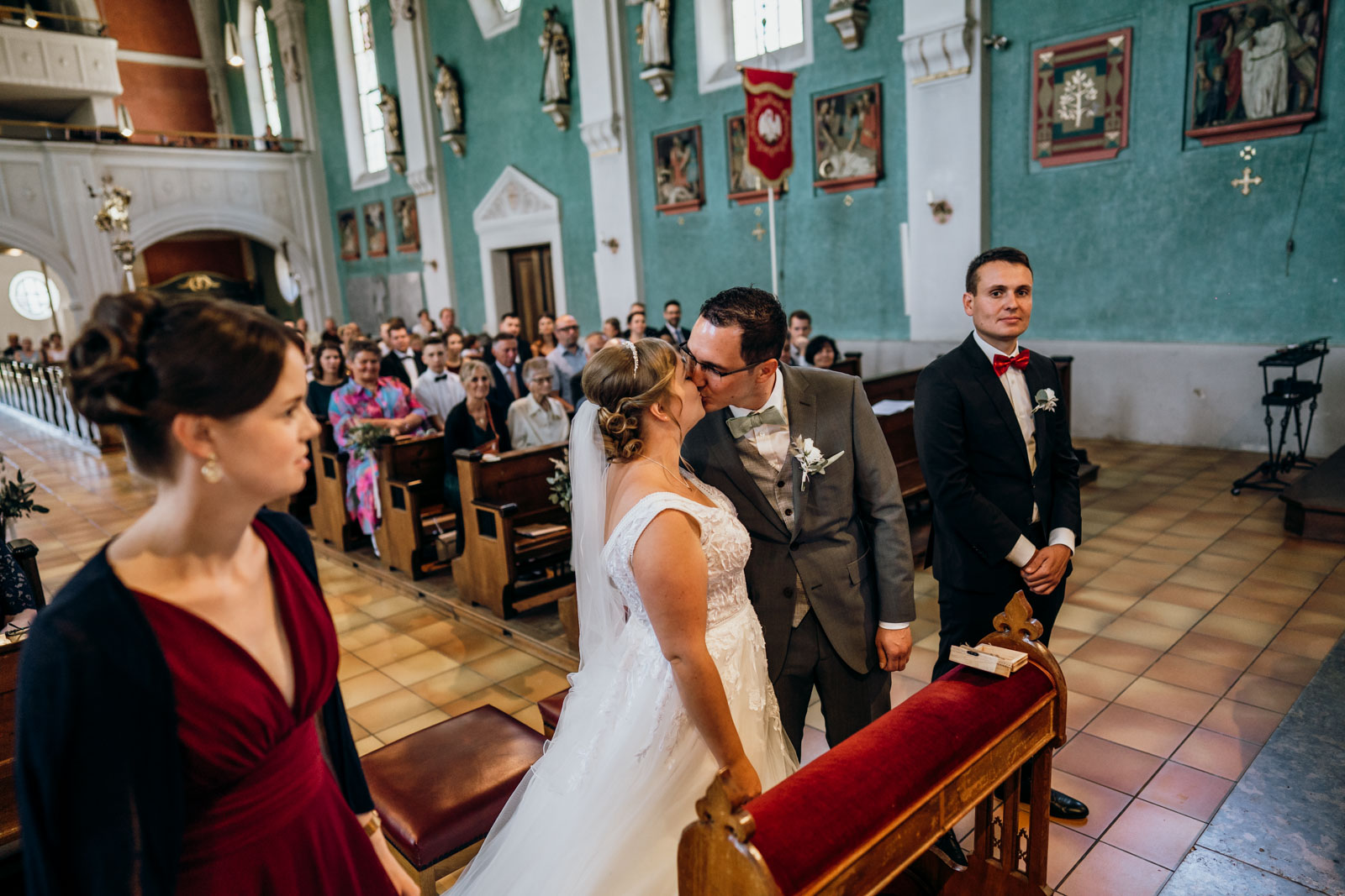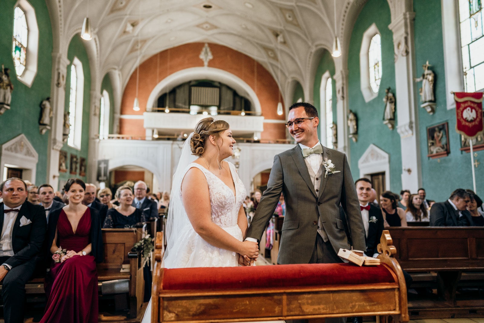 Die Trauung selbst war wunderschön. Es ist immer wieder faszinierend zu beobachten, wie sich die Nervosität in pure Freude verwandelt, sobald das Paar voreinander steht. Ob beim nervösen „Getting Ready“ im Elternhaus, beim emotionalen Ja-Wort in der Kirche oder beim ausgelassenen Tanzen unter freiem Himmel – wir sind überall dort, wo sich echte Gefühle und authentische Geschichten abspielen.