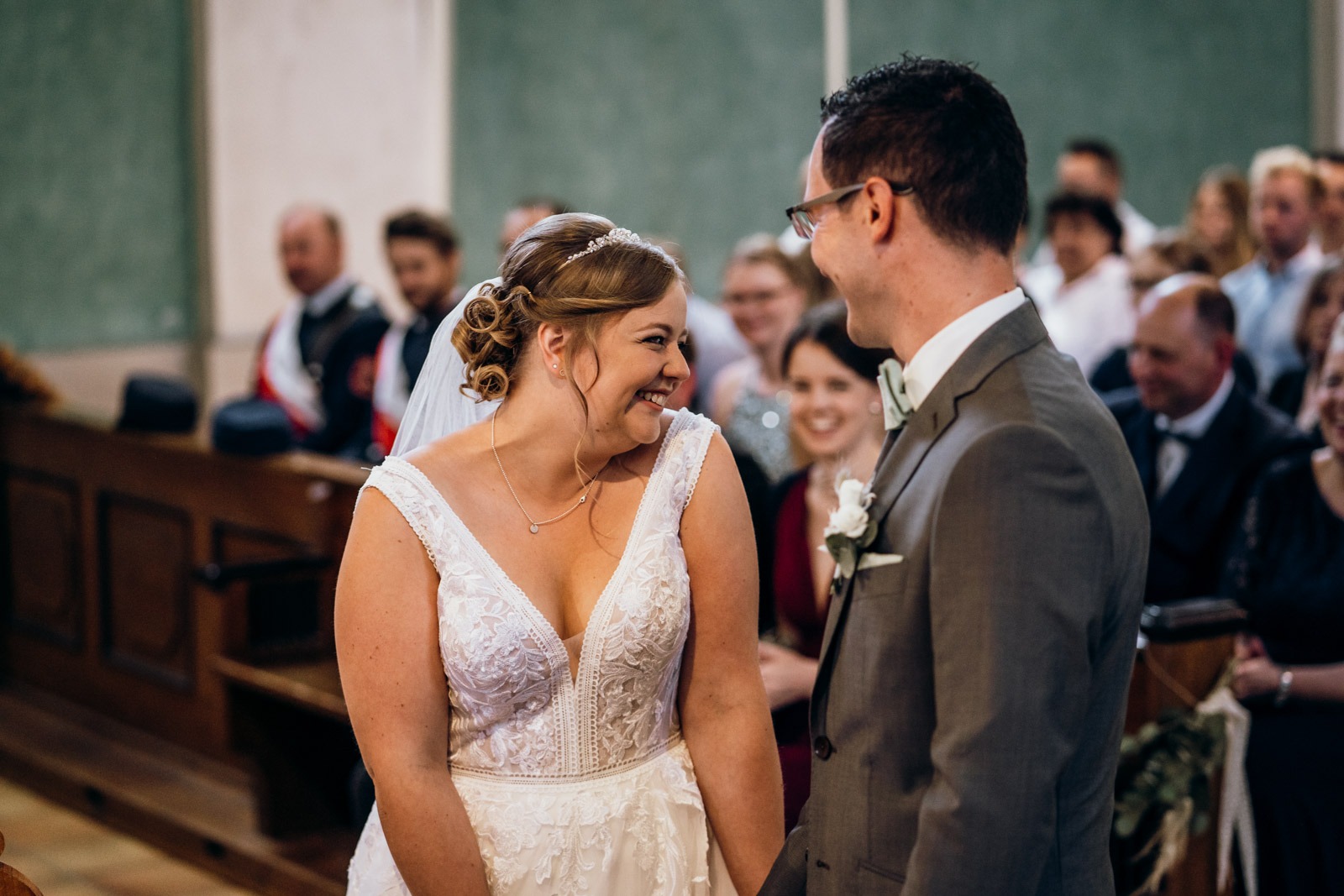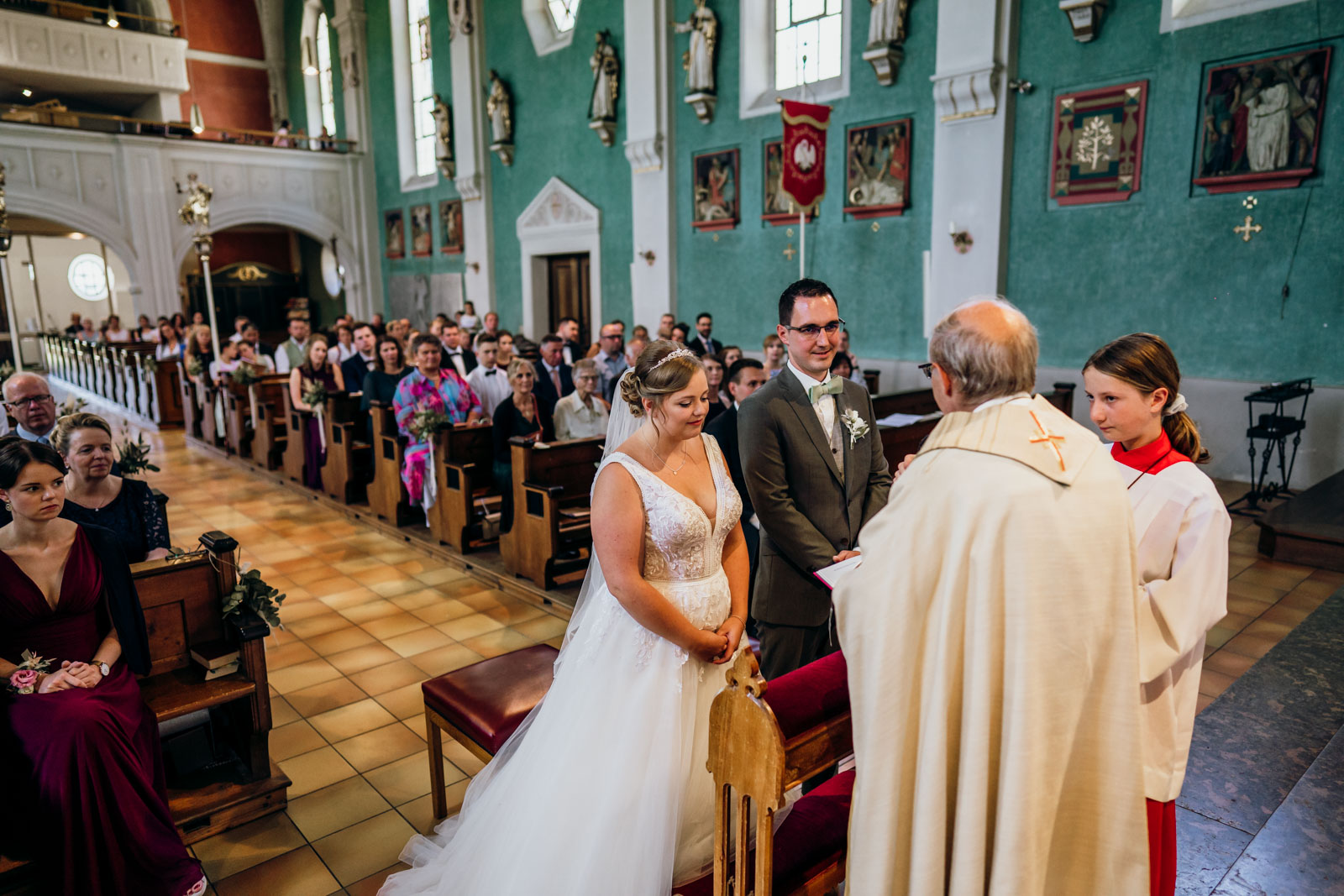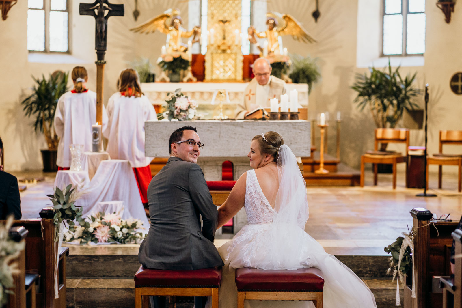 Die Trauung selbst war wunderschön. Es ist immer wieder faszinierend zu beobachten, wie sich die Nervosität in pure Freude verwandelt, sobald das Paar voreinander steht. Ob beim nervösen „Getting Ready“ im Elternhaus, beim emotionalen Ja-Wort in der Kirche oder beim ausgelassenen Tanzen unter freiem Himmel – wir sind überall dort, wo sich echte Gefühle und authentische Geschichten abspielen.